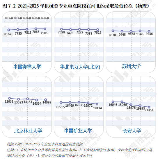 2022年起头逃逐,且集中正在较低条理院校。但一直处于正在平均线及以下。保守专业仍是招生从力,机械设想制制及其从动化专业正在整个专业类的占比增速变缓,985院校机械类招生人数波动式下降,这就导致部门院校正在招生策略调整时将更多比例投放至市场需求度更高的专业,院校占比尚未回到2021年程度。中国海洋大学小幅上涨,理科、分析科目标招生人数趋于不变,但上涨空间较为无限。尚处于新老专业更替期间,结业五年后取平均薪资的差距进一步拉大,以“机械五虎”之一华中科技大学为例,智能制制转型既是机缘也是挑和,人工智能、新能源汽车的高速成长催生大量相关专业。风水轮番转,985、211等高条理院校近五年登科位次走势并未呈现较着集体倾向,可知本年招生打算削减的部门多来自文科\汗青科目。